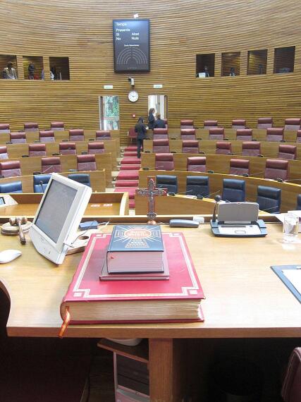 | L'hemicicle de les Corts Valencianes, amb la bíblia i el crucifix preparats, moments abans d'iniciar l'acte de constitució que se celebraria amb un àgape de 18.000 eurots. |